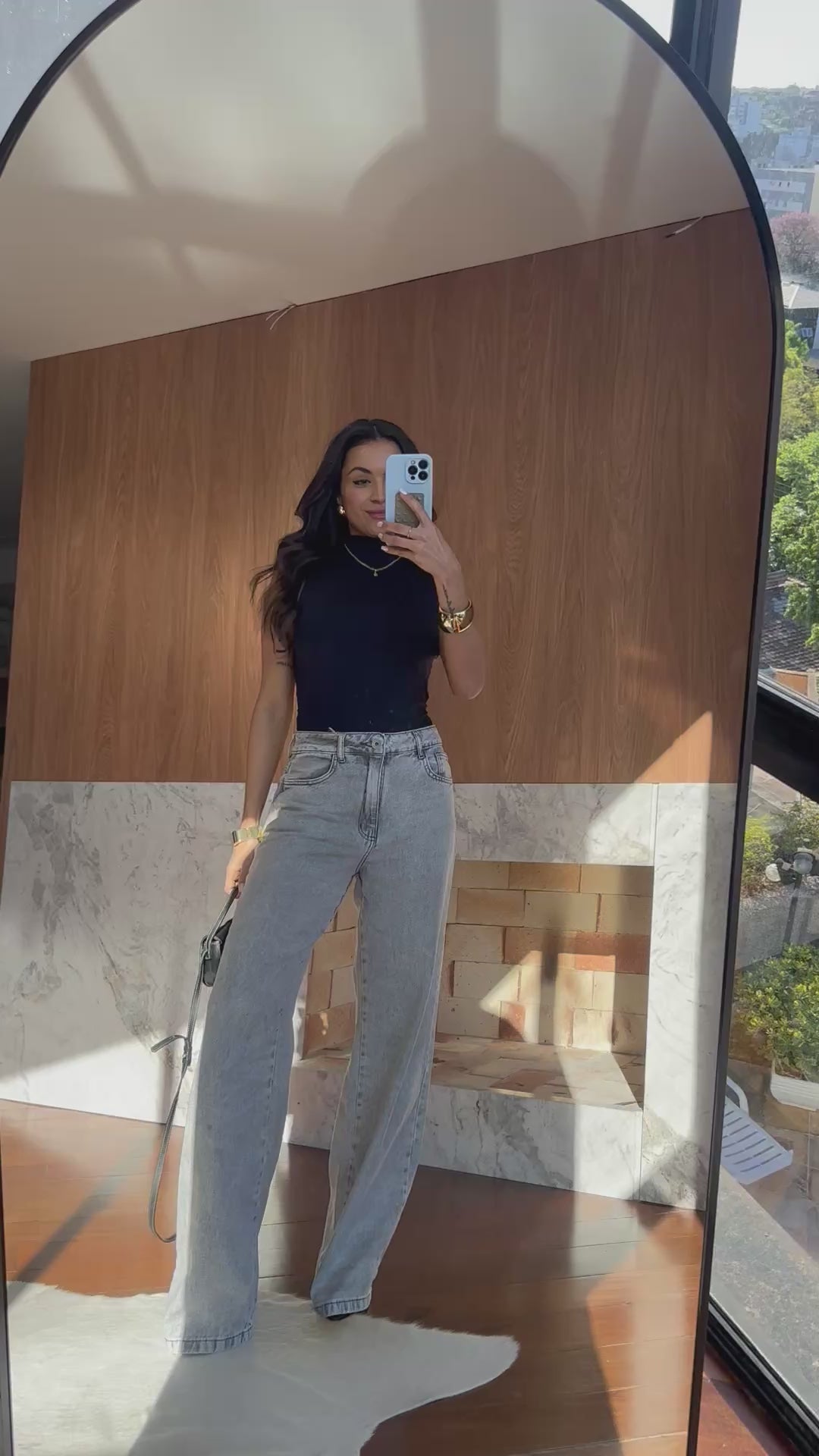 Você acabou de achar aquela wide que vai com tudo! Calça jeans modelo wide leg, cintura alta, cós com passantes aplicados para cinto, bolsos frontais e traseiro.